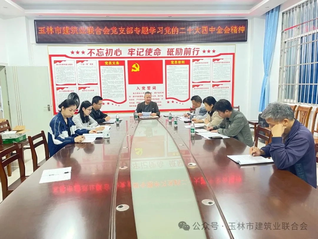 11月10日上午,玉林市建筑業(yè)聯(lián)合會(huì)黨支部召開專題學(xué)習(xí)會(huì),深入學(xué)習(xí)貫徹黨的二十屆四中全會(huì)精神。協(xié)會(huì)黨支部書記林升貴主持會(huì)議并領(lǐng)學(xué),秘書處全體員工參加學(xué)習(xí)。